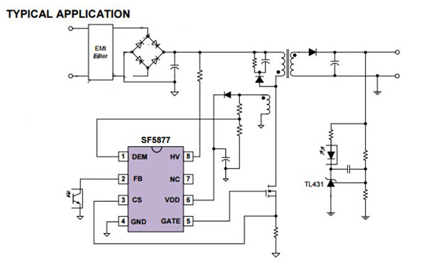 SF5877是多模式控制器。当满负荷,该IC在CCM模式或QR模式的基础上AC线路输入的工作。当负载变低时,IC进入“数字频率折返”的模式,以提高功率转换效率。当输出功率是非常小的,IC进入到突发模式,可以实现小于100mW的空载功率。