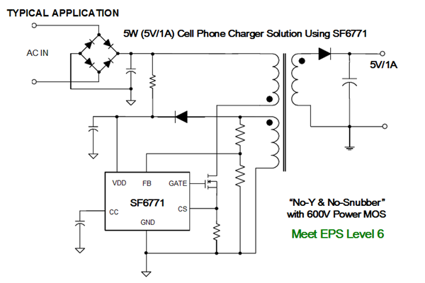 SF6771是一颗高达6级能效的高效率、高性以电源管理IC其采用先进的PSB原边控制技术,解决了能效高,保护功能齐全,精度高,稳定性高,产品体积小等一系列现低电源设计要求,主要适用于20W以内的充电器,LED驱动电源,适配器等产品中