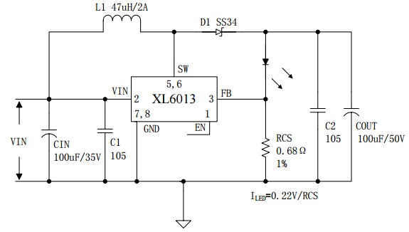 XL6013是一款升压恒流型LED驱动器,可工作在DC5V到40V输入电压范围,低纹波,内置功率MOS。XL6013内置固定频率振荡器与频率补偿电路,简化了电路设计。