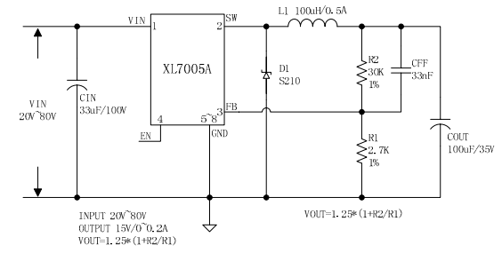 XL7005A是一款高效、高压降压型DC-DC转换器,固定150KHz开关频率,可提供最高0.4A输出电流能力,低纹波,出色的线性调整率与负载调整率。XL7005A内置固定频率振荡器与频率补偿电路,简化了电路设计。 PWM控制环路可以调节占空比从0~100%之间线性变化。内置输出过电流保护功能,当输出短路时,开关频率从150KHz降至45KHz。内部补偿模块可以减少外围元器件数量.