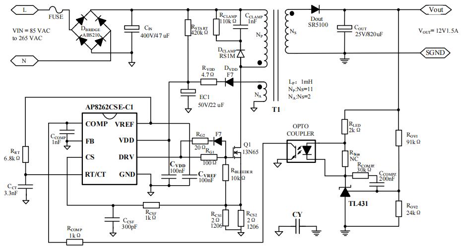 AP8262C启动电流低于0.1mA,静态工作电流低于3mA。工作频率可达500kHz。内置VDD箝位电路,同时芯片集成逐周期过流保护、和欠压锁定保护。