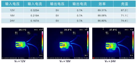温升测试:测试条件:Vin=12/18/24V, Vout=5V/0.7A, 环境温度25℃,Demo半开放、无风环境;