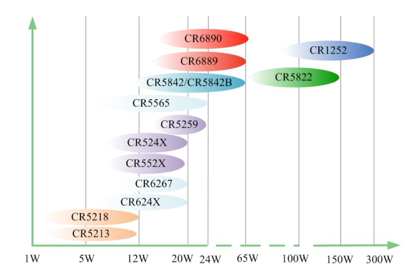 目前CR(chip-rail)品牌产品线主要包括:绿色节能电源管理器、马达驱动器、音频处理、物联网传感节点信号采集及处理芯片、混合信号的系统级芯片等。