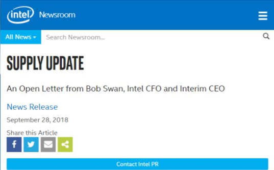 英特尔临时CEO Bob Swan在官网上的一封公开信中表示,公司有足够的芯片供应,来满足全年收入前景,同时Swan还表示,英特尔的10nm工艺已经取得进展,产能正在改善,预计在2019年实现量产。