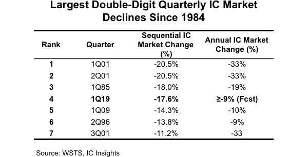 按照以往的规律,隔几年全球半导体业就会发生一些波峰到波谷的轮回,而这一次无疑就是到了波谷了,同时市调机构IC Insights也给出了类似的结论,第三季度芯片行业跌幅达17.1%,是自2001年以来的最大跌幅,也是自1984年以来的第四大,仅次于2001年第一第二季度(互联网泡沫破裂)的20.5%、1985年第一季度的18.0%。